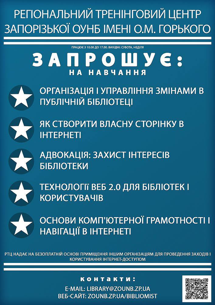 Бібліоміст Обучение в РТЦ 2010 РТЦ: боевое крещение "Бібліоміст" в Запоріжжі РТЦ для библиотекарей Бердянска Инновации в библиотеках Презентация интернет-зала для детей "Паутинка" Как создать свою страничку в Интернете Региональный тренинговый центр: Труды и дни Навчання бібліотекарів Мелітополя Організація та управління змінами в публічній бібліотеці Творчество запорожских мастериц в Интернете 2011 Ликвидация безграмотности Тренінг для активістів регіонального молодіжного еколого-краєзнавчого центру "Сварог" У навчанні не зупиняйтесь В Региональном тренинговом центре Окончание как начало РТЦ: тренінг за участі фахівців з ІТ Про доступ громадян до офіційної інформації Книги от программы "Бібліоміст" Навчаються переможці програми "Бібліоміст" - бібліотекарі Бердянська Центри вільного доступу до Інтернету відкрито у п'яти міських бібліотеках Запорізької ЦБС для дорослих UCOZ: сотворение сайта за пять дней Бібліотека та соціальне партнерство Победители новогоднего библиотечного квеста 2012 Региональный тренинговый центр в 2011 году (итоговая презентация) Новый год в региональном тренинговом центре Запорізькі переможці конкурсу програми "Бібліоміст" Upgrade программы обучения пожилых людей Мобільні технології в бібліотеках Всемирный День Интернета в РТЦ Евро-2012 и график обучения в РТЦ не связаны Региональный тренинговый центр: F5 Технологии Web 2.0 для библиотекарей Бердянска Клуб знатоков православной культуры Православное Запорожье: презентация Интернет-ресурсов и периодических изданий Презентація авторів litfest.ru Альманах "Махаон" в лицах и текстах Запорізьке краєзнавство: історія, сучасність, особи Плоды просвещения 2013 Татьянин день для студентов "третьего возраста" в РТЦ библиотеки Новорічне привітання від Запорізького РТЦ Тренинг для библиотекарей запорожских университетов Новые возможности развития библиотечной среды Из жизни РТЦ (комикс) Региональный тренинговый центр: обучение продолжается 2014 Педагогические встречи Тренінг «Публічні бібліотеки – мости до електронного урядування» Выпускники РТЦ: отзывы и рекомендации 3935 просмотров