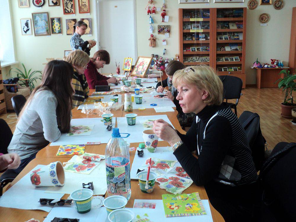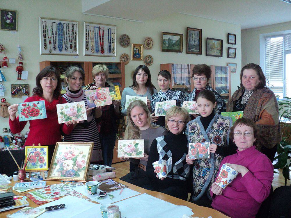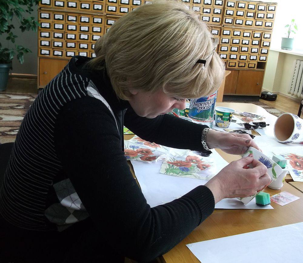 5 березня у відділі мистецтв відбувся майстер-клас з декупажу. Провела заняття професійна художниця з творчого об’єднання «Колорит» Світлана Павлівна Ворончіхіна. Учасники майстер-класу займались виготовленням власних робіт у техніці декупаж. В перекладі з французької мови слово декупаж означає «вирізання». А в Википедии про декупаж еще написано, что это "декоративная техника по ткани, посуде, мебели и пр., заключающаяся в скрупулёзном вырезании изображений из различных материалов (дерева, кожи, тканей, бумаги и т. п.), которые затем наклеиваются или прикрепляются иным способом на различные поверхности для декорирования". Існує декілька видів декупажу: класичний, декупаж під старовину, об’ємний декупаж. Наші учасники виконували свої роботи в класичному стилі. Для цього їм знадобилися серветки з візерунками, клей ПВА, спеціальна ґрунтована основа, об’ємний гель та лак (для завершення роботи). Майстер-клас пройшов у дружній атмосфері спілкування художниці та учасників. Кожен створив власноруч свій маленький шедевр.