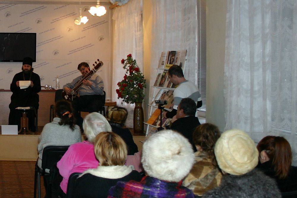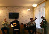 20 декабря в гостях у библиотеки побывали музыканты группы «Табор уходит в небо» - протоиерей Свято–Покровского архиерейского собора Вячеслав Власенко (гитара), настоятель храма Веры, Надежды, Любови и матери их Софии Игорь Савва (ситар), Михаил Надь (губная гармошка). Фронтмен группы Вячеслав Власенко о своем стиле: легкий джаз, импровизация. Его влечет аутентичная, фольклорная музыка, в песнях для него главное –стихи. Концерт был добр, мягок и лиричен.