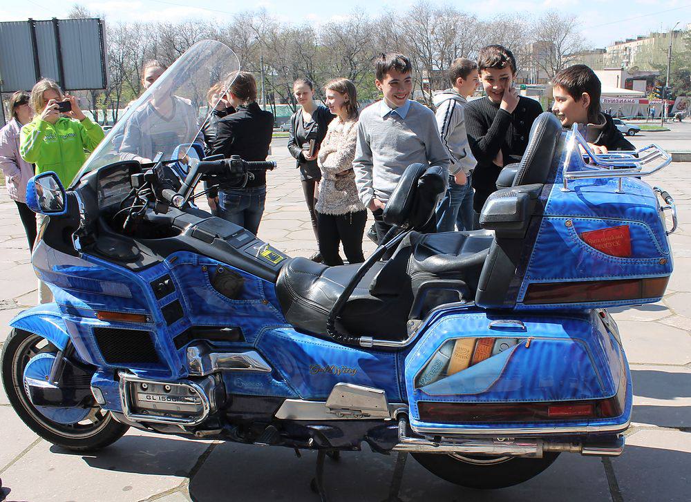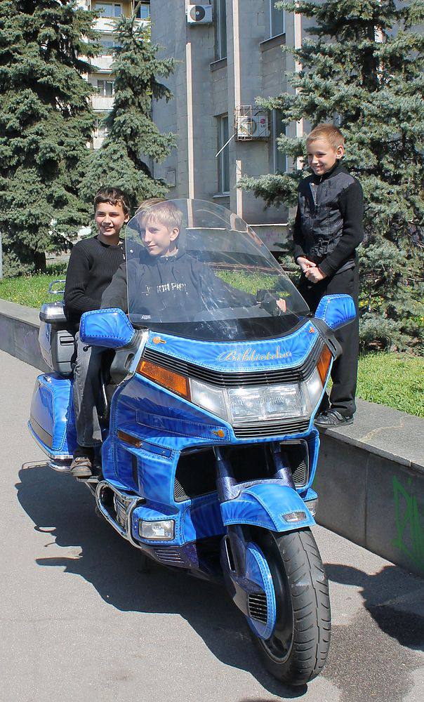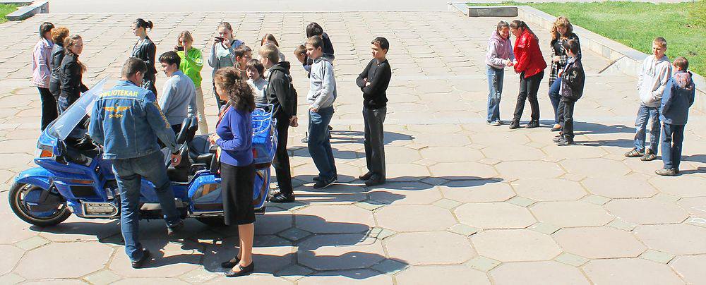 Квітневого дня наших читачів і бібліотекарів заїхав привітати із Всесвітнім Днем Книги та авторського права байкер Bibliotekar Олександр. Як каже власник «джинсового» байку – «…обожнюю книги та подорожі, тому у кофрі завжди є щось цікавеньке почитати...». На деякий час байк Олександра з розписом на бібліотечну тематику став візитівкою бібліотеки: користувачі навіть фотографувалися поряд з мотоциклом. Вихованці шкіл-інтернатів, які у цей день відвідали бібліотеку, поговорили з Олександром про книги і мотоцикли.