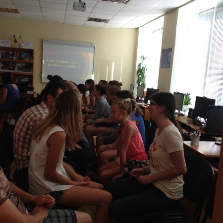 13 липня на засідання клубу завітав з подарунками гість з Техасу HC Gotcher. Він розповідав про президентські вибори в США. Наступне спілкування учасників відбувалося у форматі Speed English та Stand-Up English. Наприкінці всі грали в Hot Seat та Draw it і виконували різноманітні вправи з використанням інтерактивної дошки, особливо ресурси з сайту Triptico.