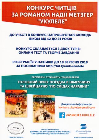 Конкурс читців за романом Надії Метзгер "Укулеле" 559 просмотров Добавить комментарий Ваше имя Комментарий * Поменять на расширенный редакторБолее подробная информация о текстовых форматах Текстовый формат Гость фильтрФильтр HTMLPlain text Гость фильтрДопустимые HTML-теги: <em> <strong> <cite> <code> <ul> <ol> <li> <dl> <dt> <dd> <br> <p>Строки и абзацы переносятся автоматически.Фильтр HTMLДопустимые HTML-теги: <a> <hr> <em> <strong> <cite> <code> <ul> <ol> <li> <dl> <dt> <dd> <img>Строки и абзацы переносятся автоматически.Plain textHTML-теги не обрабатываются и показываются как обычный текстАдреса страниц и электронной почты автоматически преобразуются в ссылки.Строки и абзацы переносятся автоматически.