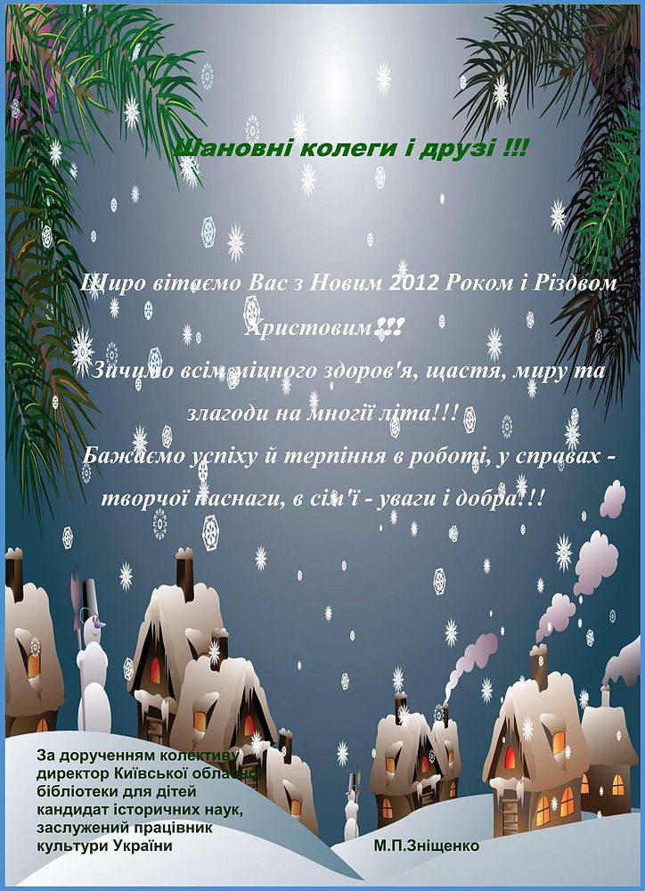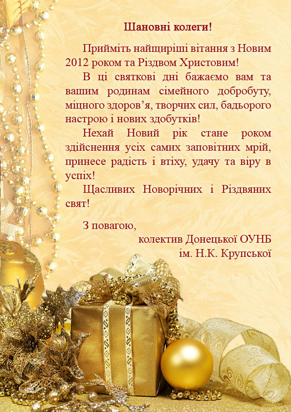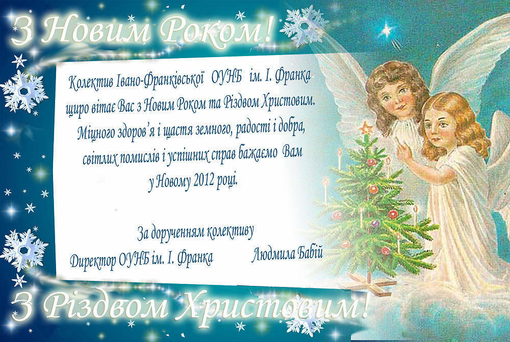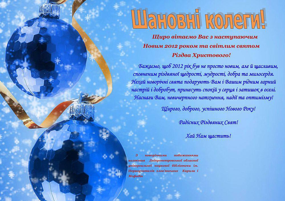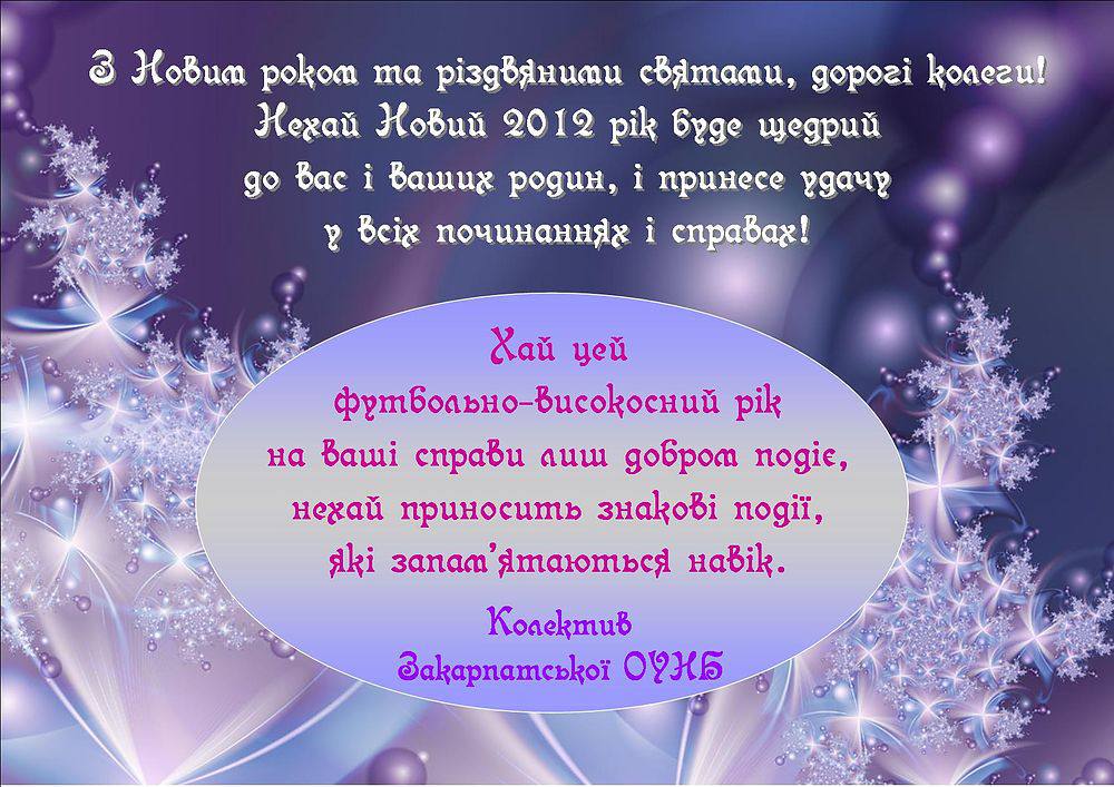 Бажаємо, щоб 2012 рік був не просто новим, але й щасливим, сповненим різдвяної щедрості, мудрості, добра та милосердя. Нехай новорічні свята подарують Вам і Вашим рідним гарний настрій і добробут, принесуть спокій у серця і затишок в оселі. Наснаги Вам, невичерпного натхнення, надії та оптимізму! Щирого, доброго, успішного Нового Року! Радісних Різдвяних Свят! Хай Нам щастить!